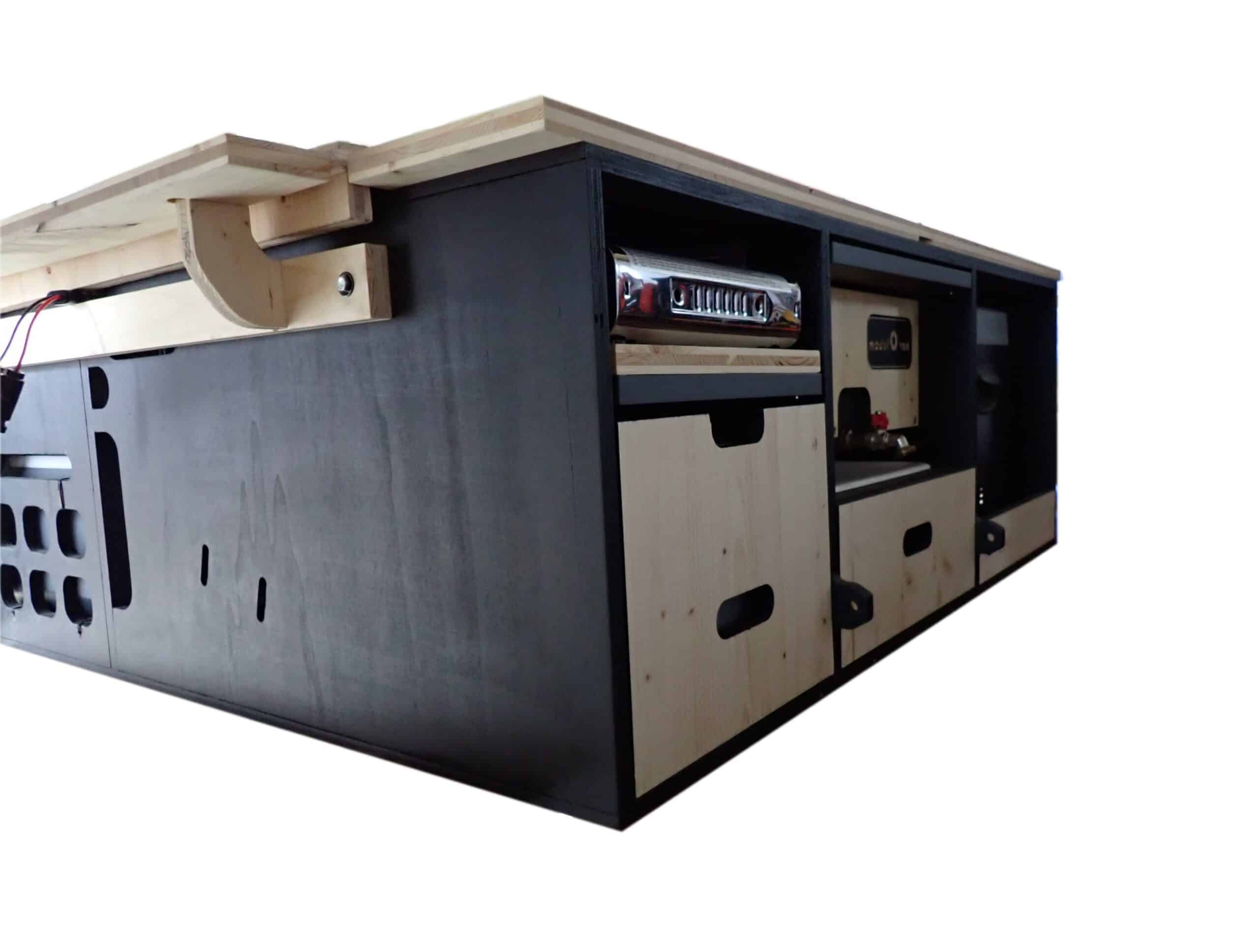 ► Nos tiroirs sont réalisés en menuiserie, selon notre conception. Nous n’utilisons pas de tiroirs en provenance de fabricants industriels comme souvent dans le cas des cuisinistes, car un véhicule est en mouvement, avec des sollicitations mécaniques importantes (forces d’inerties, vibrations,…). Il faut une construction robuste et adaptée.