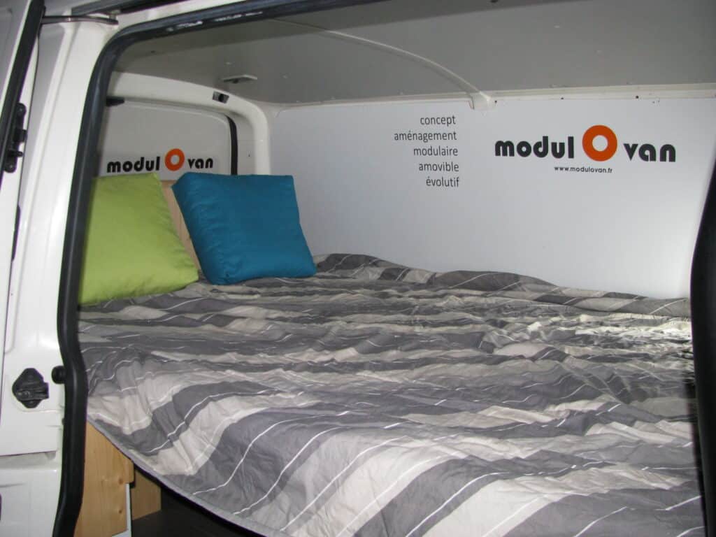 modulOvan a mis au point un concept de calage par plancher qui permet d’immobiliser l’aménagement à l’intérieur du véhicule. Ce système ne nécessite aucune fixation au sol, donc aucune modification du véhicule (ce qui rend le kit 100 % compatible « non VASP »). Seul modulOvan maitrise ce concept qui nécessite une expérience et beaucoup de rigueur dans la découpe du plancher (réalisée en commande numérique). Il permet de débarquer ou d’embarquer très facilement le kit, pour tout usager qui a fait le choix de conserver la polyvalence de son véhicule et de ne pas l’utiliser uniquement en véhicule de loisirs.