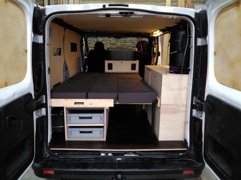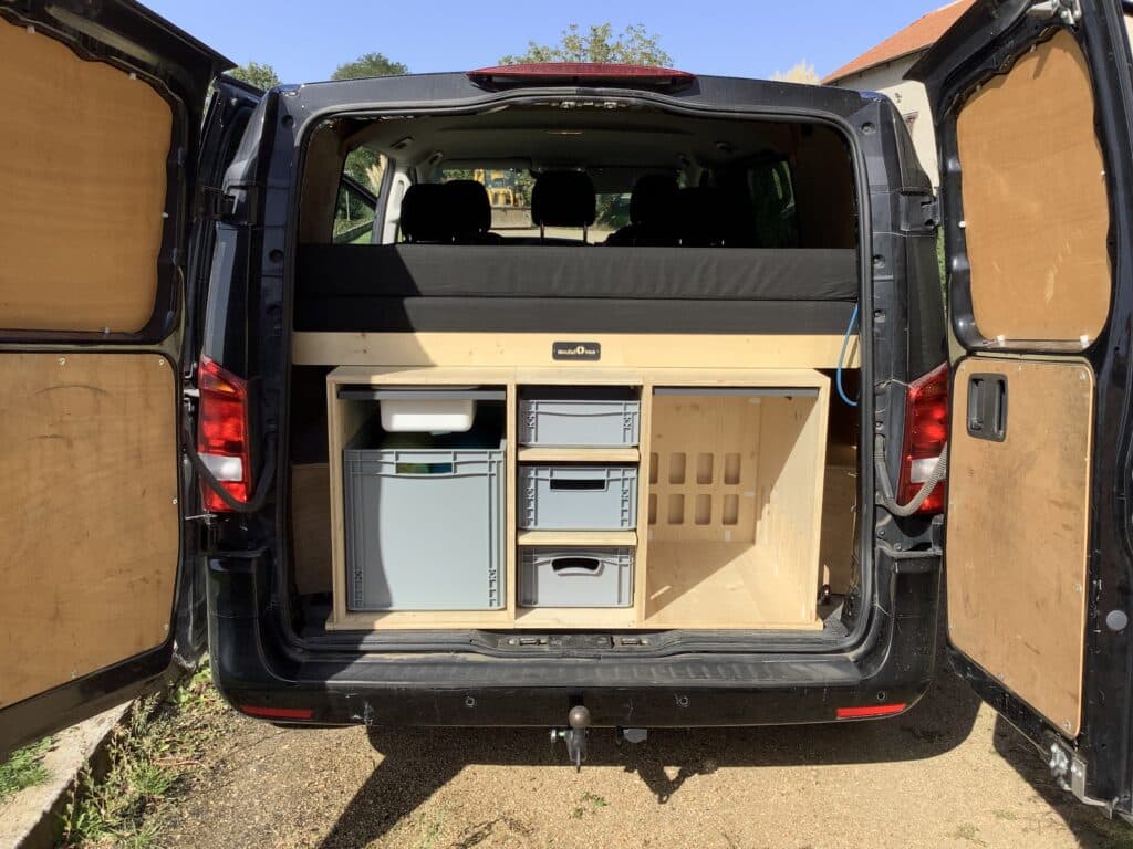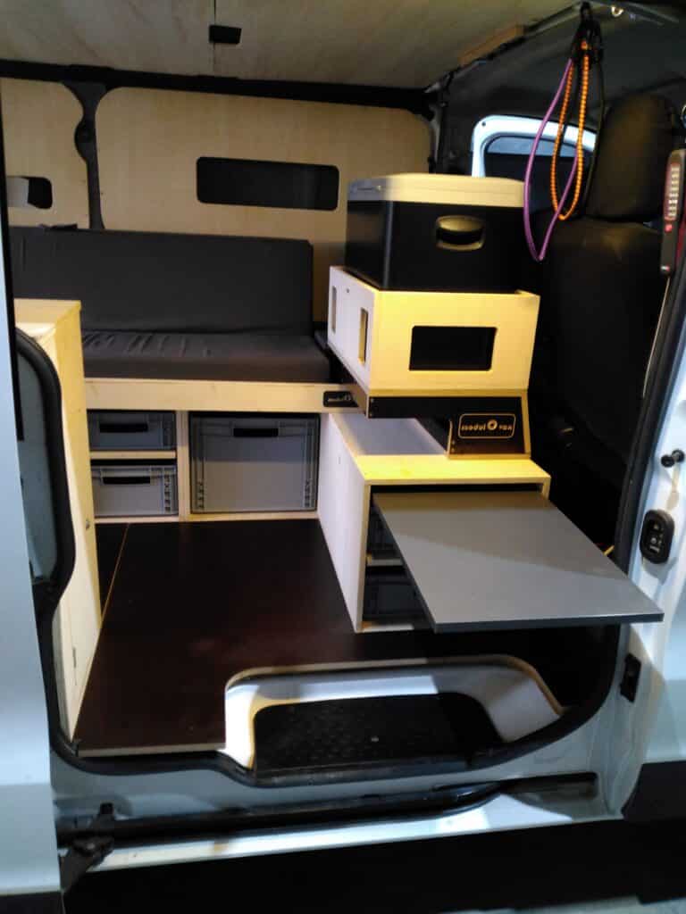 En terme de budget, nos kits se situent dans une fourchette comprise entre 2 000€ et 5 000 € selon l’importance du mobilier, les finitions (que vous pouvez également faire à notre place) et surtout des équipements contenus dans les box (tiroirs, étagères, glacière à compression, batterie autonome, évier, réchaud, bacs plastiques,….). Tous nos produits sont tarifés, ce qui permet une transparence lors du devis, de la commande et de la facturation. La modularité de notre offre vous permet également d’équiper votre van par étapes. Par exemple, les compartiments des box peuvent être équipés d’étagères ou de tiroirs dans un second temps.