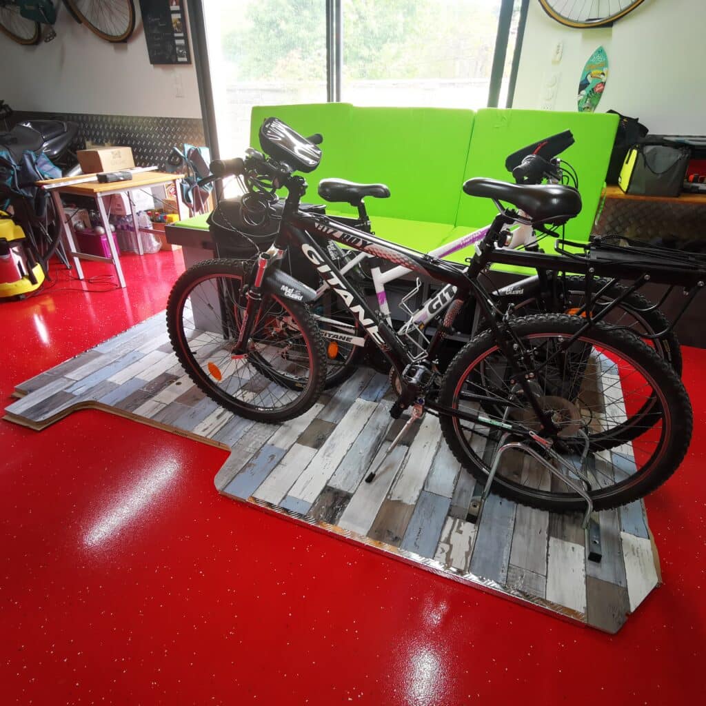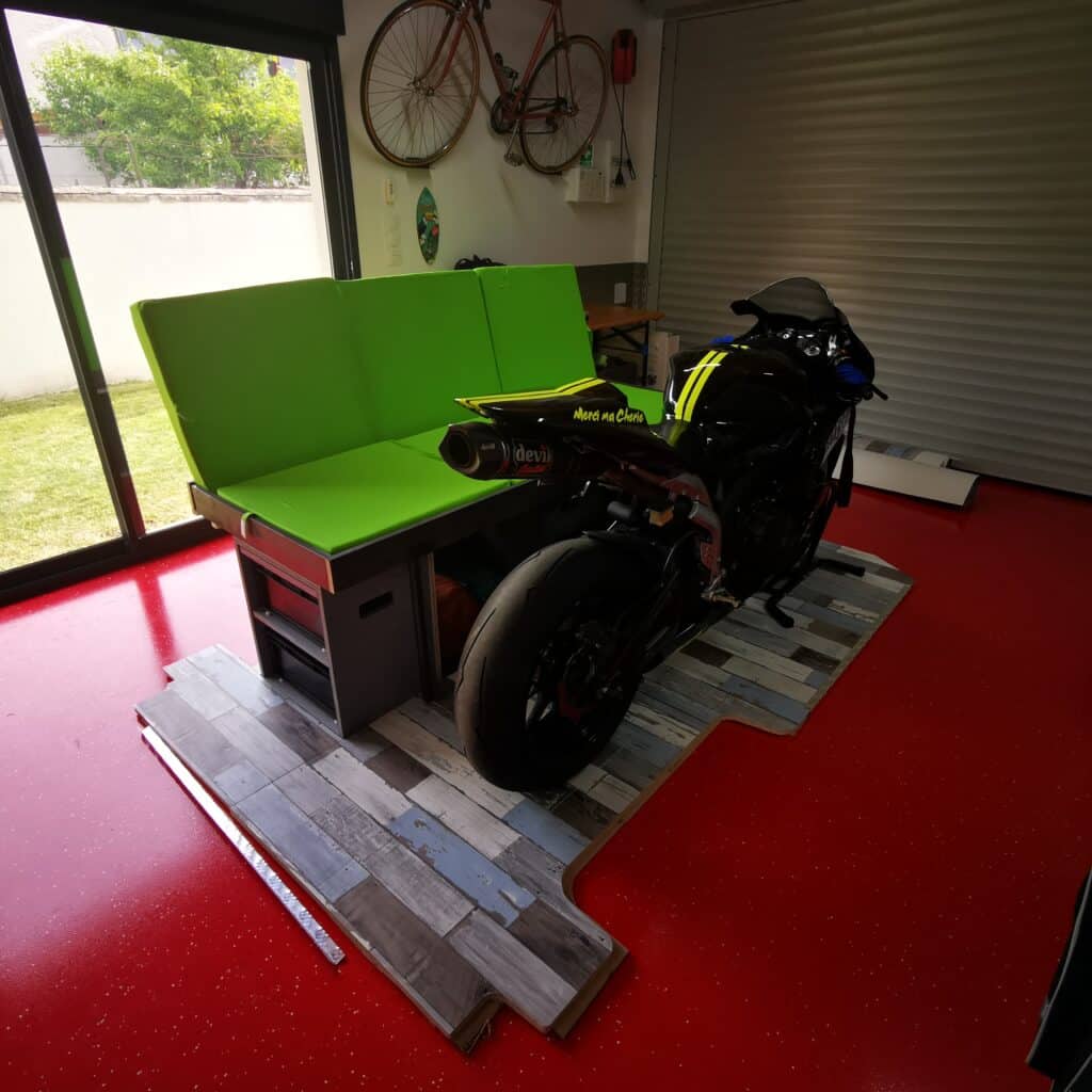 Lors que le kit n’est pas monté dans la van, il trouve sa place dans le garage qui sert aussi à recevoir des amis.